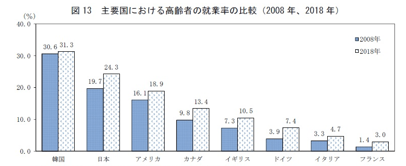 ちなみに、海外と比較しても、日本の高齢者は働き者であることがわかります。高齢者の就業率が10%に満たない国がある中で、日本は20%超。勤勉性は数字にも表れていますね。