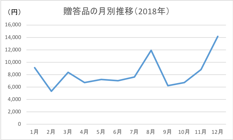 上記は、贈答品の月別支出金額の推移を表したグラフです。二人以上世帯を対象とした2018年の家計調査をもとに作成しています。年間では12月の支出が14,144円と最も多く、次いで、お中元などがある8月の支出が11,917円と多くなっています。