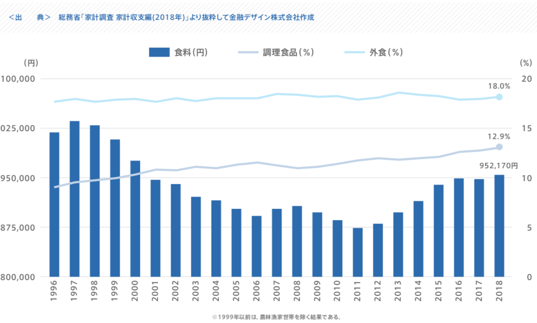 上記はFPデータSELECT100でご紹介している食料品の支出の推移です。食料品全体の支出は金額で、うち調理食品と外食はそれぞれ食料品に占める割合で表示されています。