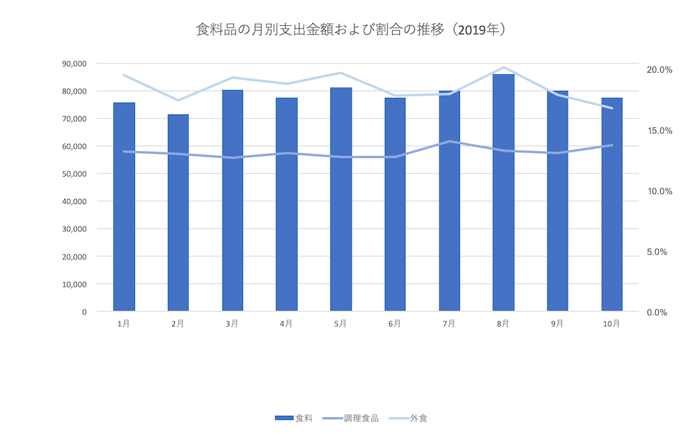 上記は2019年の月別の食料品の支出の推移です。食料品全体の支出は金額で、うち調理食品と外食はそれぞれ食料品に占める割合で表示されています。10月の外食は16.8%と、1月から10月の中で最も低い割合となっていました。また、10月の調理食品は13.7%と、7月の14.0%に次いで2番目に高くなっています。