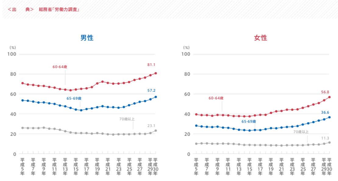 平成5年時点では、60~64歳の就業率は男性が約70%、女性が約40%でしたが、平成30年ではそれぞれ約80%、約60%となっています。他の年齢層も同様に、就業率は上がっていることがわかります。70歳以上でも男性の約2割、女性の約1割は働いており、今後、高齢化とともに高齢者の労働力が求められることを考えると、就業率はさらに上がっていきそうです。