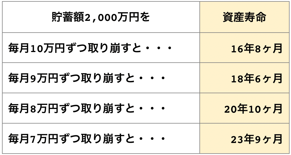 下表のとおり、貯蓄額2,000万円を取り崩す場合、毎月8万円だと20年10ヶ月で底をつくのに対して、毎月7万円だと23年9ヶ月に延びます。つまり、取崩額を月1万円抑えることで、貯蓄は3年近く長持ちするということです。