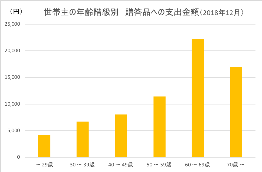 世帯主の年齢階級別に贈答品の支出金額を見てみると、60~69歳が22,148円と最も多く、その金額は最も少ない29歳以下の5倍以上です。
