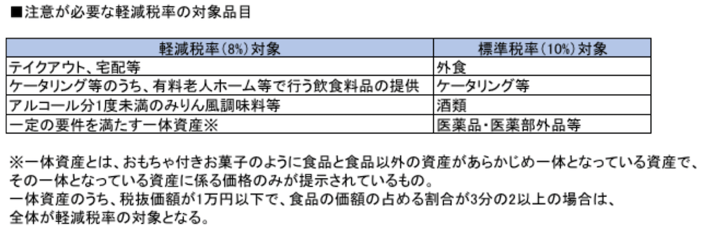 軽減税率制度とは、消費者の税負担を軽減するために、生活必需品の一部の税率が8%に据え置かれる制度のことで、飲食料品が含まれます。スーパー等で売られている飲食料品の多くは消費税8%に据え置かれていると考えてよいでしょう。