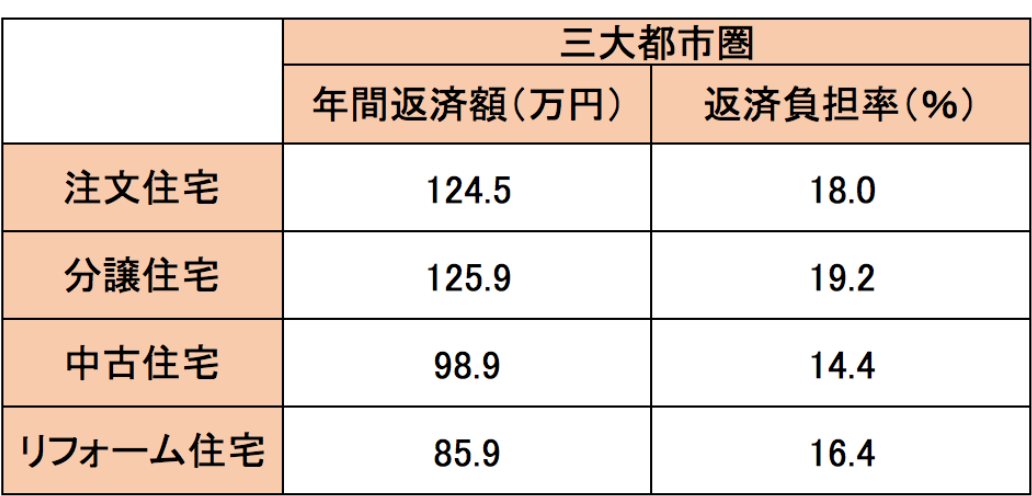 分譲住宅をみると、年間返済額125.9万円で19.2%なので、年収は約656万円の世帯が平均的。