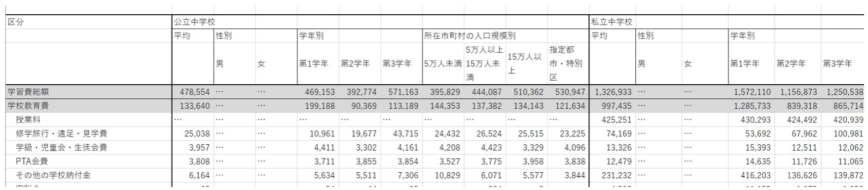 ちなみに、下記の表が「子供の学習費調査」の元データです。比べていただくと、「FPデータSELECT100」の見やすさを実感していただけるのではないかと思います。