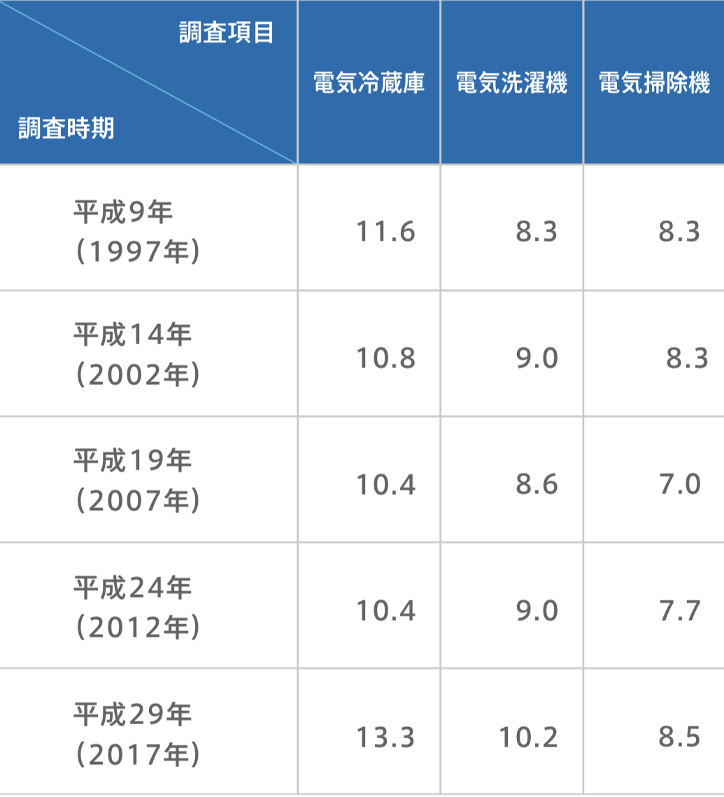 上記はデータの一部ですが、最新の平成29年では、買替えの年数が冷蔵庫約13年、洗濯機約10年、掃除機約9年となっています。20年前と比べると家電の寿命も延びているようです。