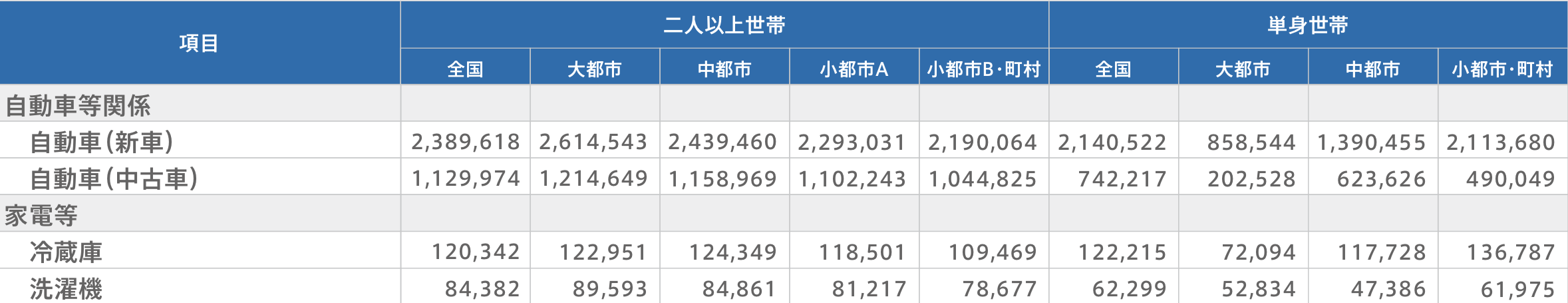 こちらもデータの一部をご紹介します。例えば、大都市(政令指定都市および東京都区部)では、二人以上世帯では、冷蔵庫は約13万円、洗濯機は約9万円。単身世帯では、冷蔵庫は約11万円、洗濯機は約5万円。