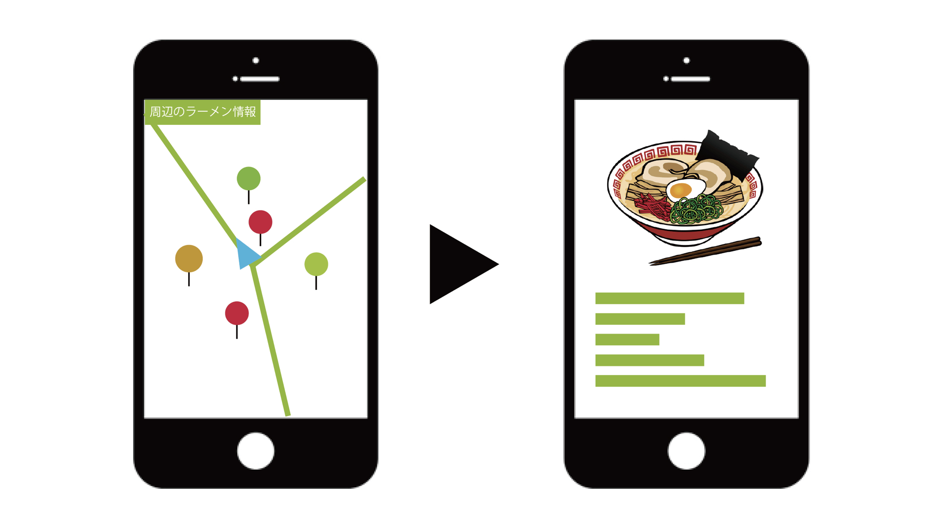APIとはそもそも何なのか。私がそのワードを知ったきっかけは、とあるアプリの存在を知ったことから始まります。それは、「現在地周辺のラーメン屋さんを、評価を含めてマップ上に表示してくれるという、ラーメン好きにはたまらないアプリでした。