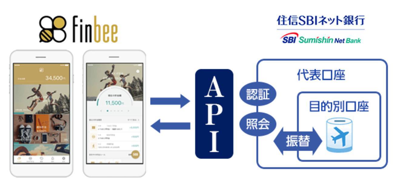 同行とAPI接続をすることで、同行のサービスである目的別貯金にfinbeeのアプリを使って資金移動ができます。このように口座の情報を書き換えるAPIは 「更新系API」と呼ばれています。また、同行のデビットカードを使うことで、おつり貯金も可能になります。